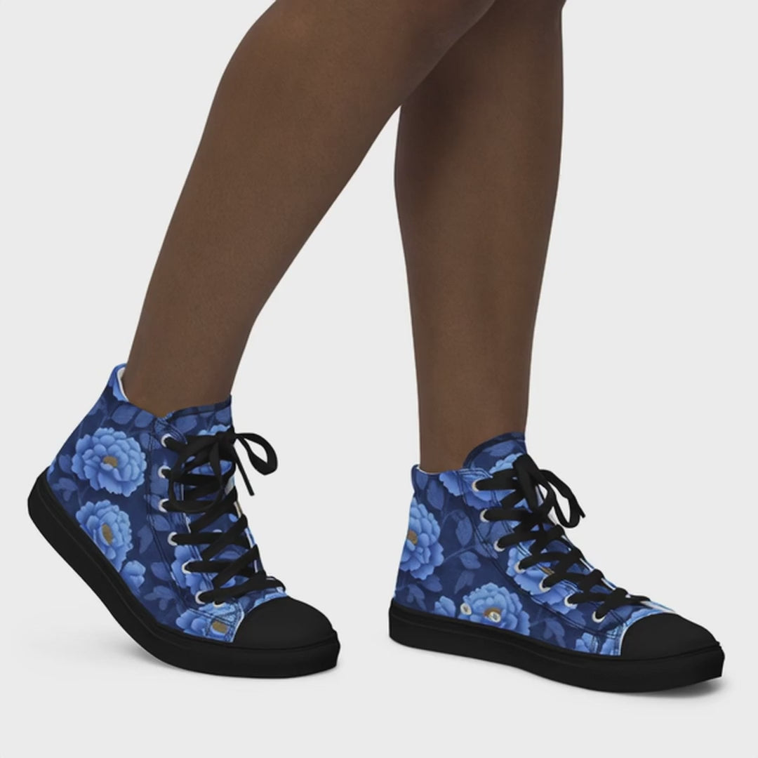 Step into style with these bold blue rose high-top canvas shoes. Featuring a rich navy floral design with black faux leather toe caps and outsoles, they're a perfect blend of softness and edge. Ideal for Gen Z women who love making a statement—especially fiery Leos and cool-headed Aquarians.