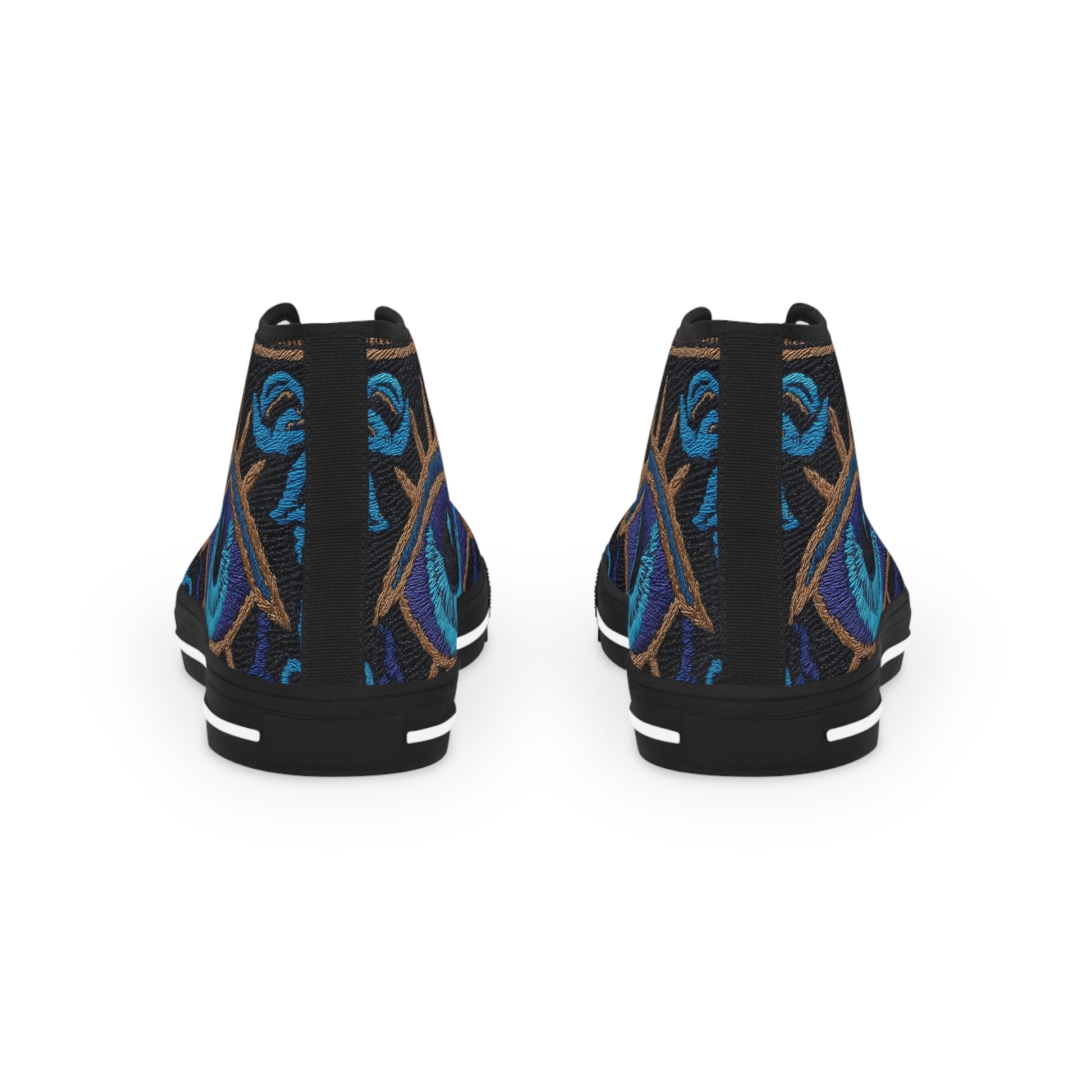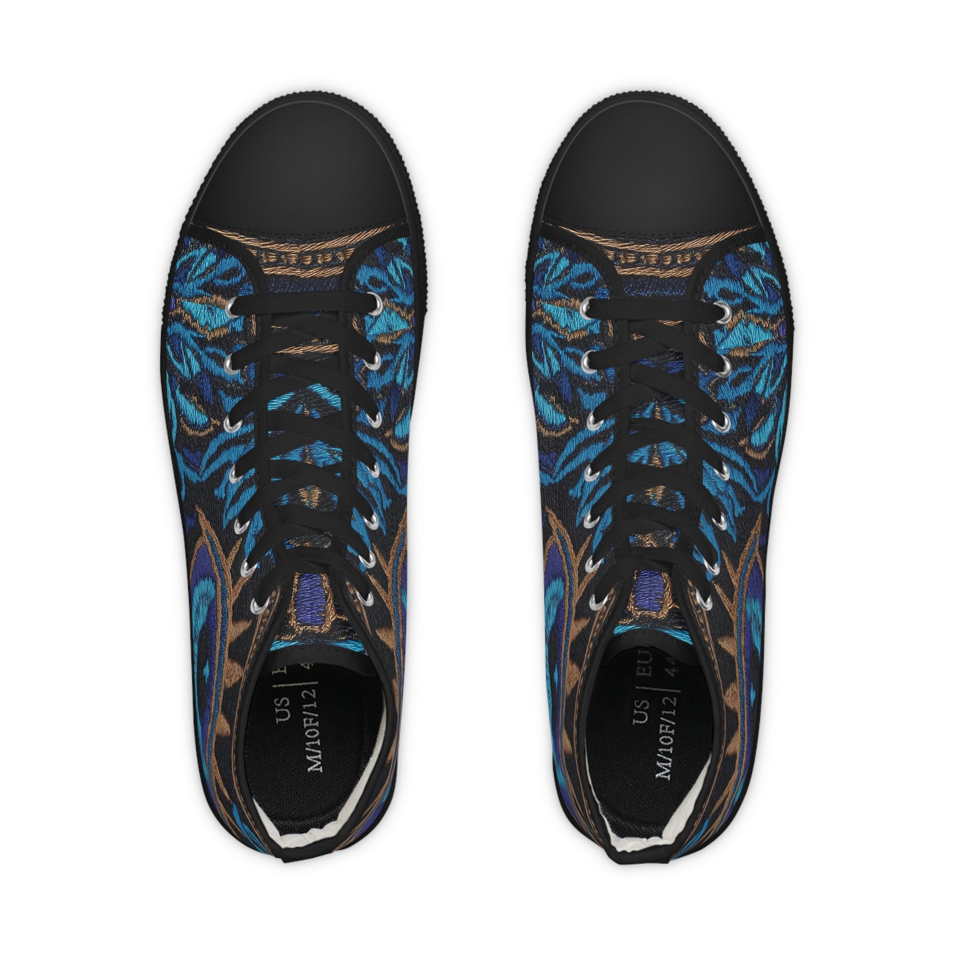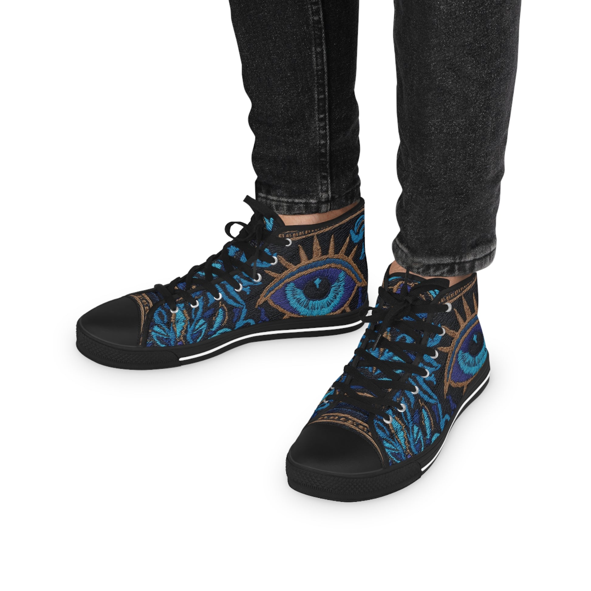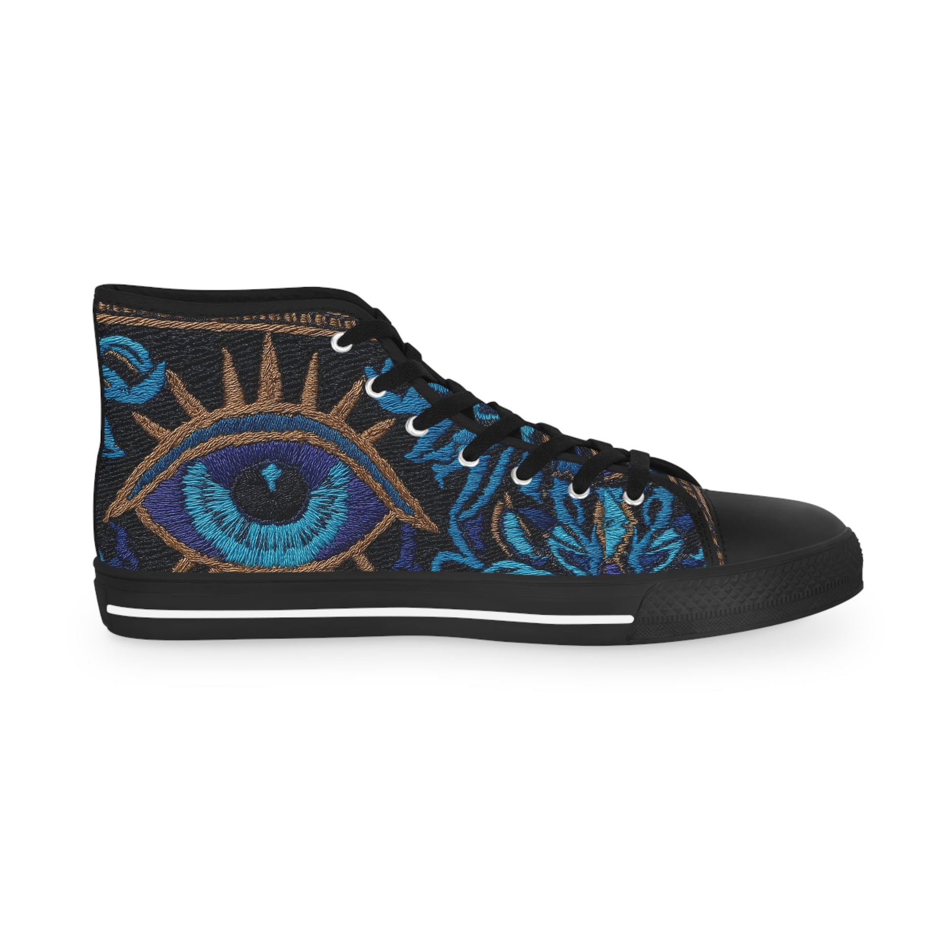 These high-top sneakers feature a printed faux-embroidery texture design, showcasing a mystical eye pattern with deep blue and golden accents. The shoes look like embroidery but are crafted with lightweight printed canvas, making them stylish yet easy to wear. Designed for Gen Z fashion lovers, especially ages 18-30. A perfect gift for Leo (bold & confident) and Aquarius (unique & creative). Great for streetwear, travel, or festival outfits.