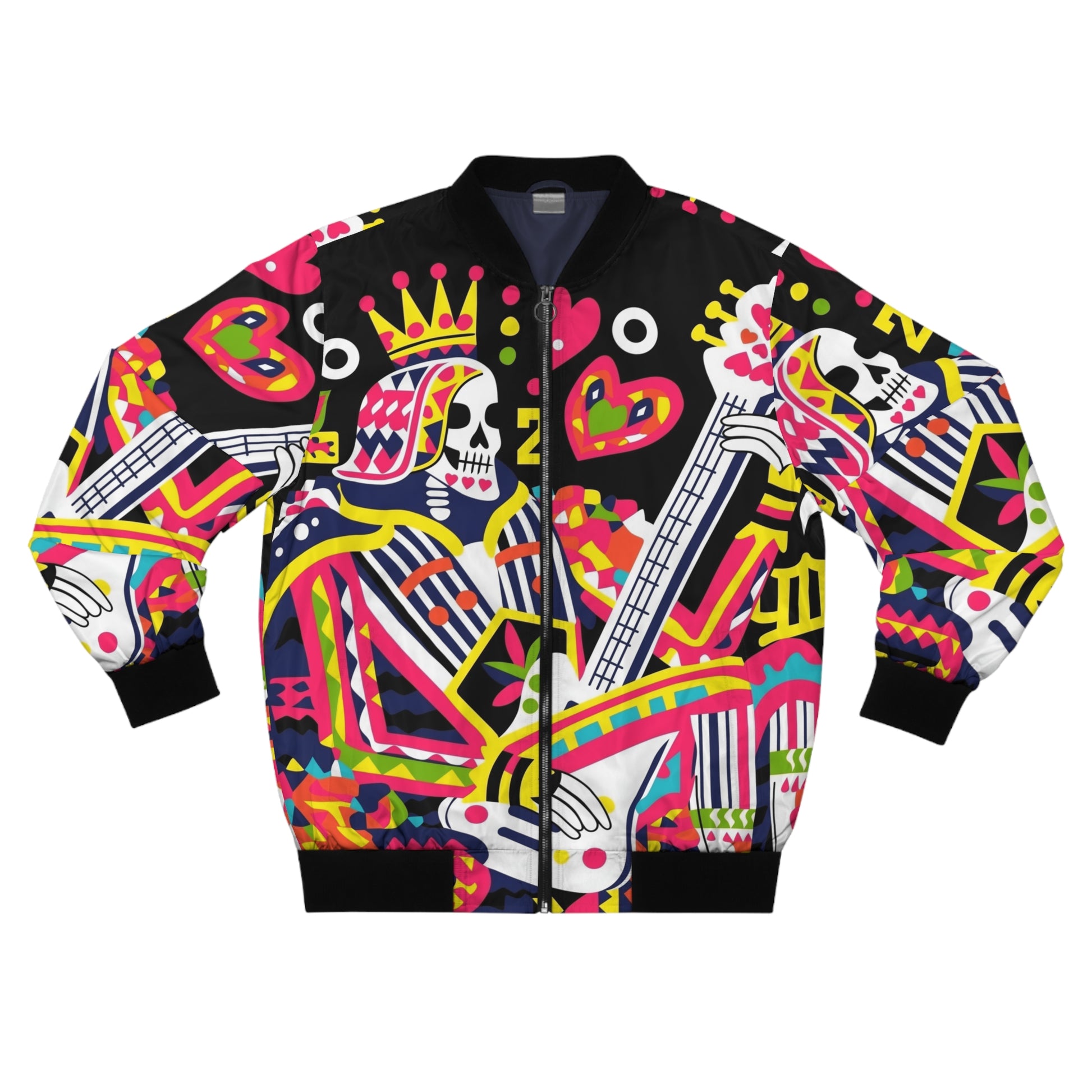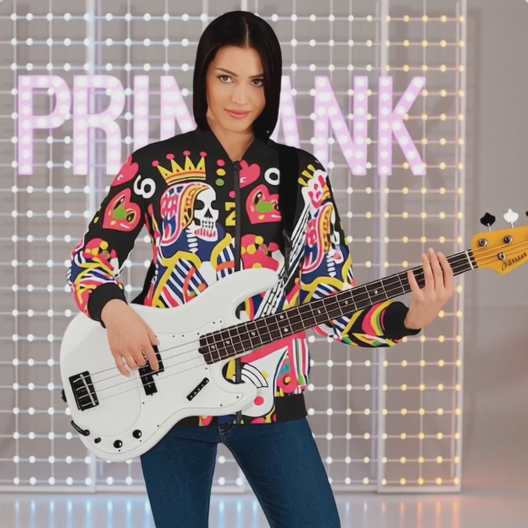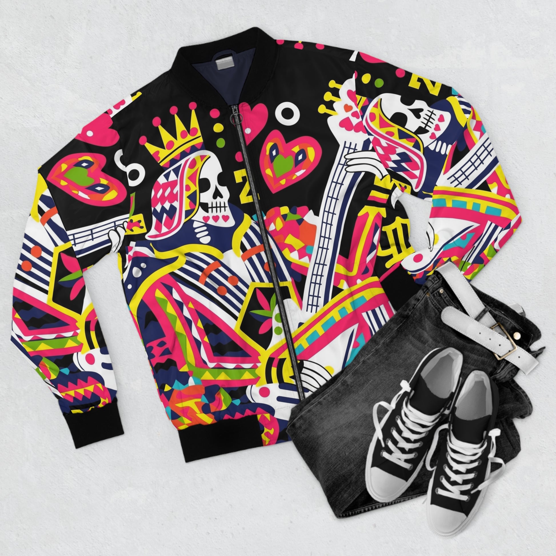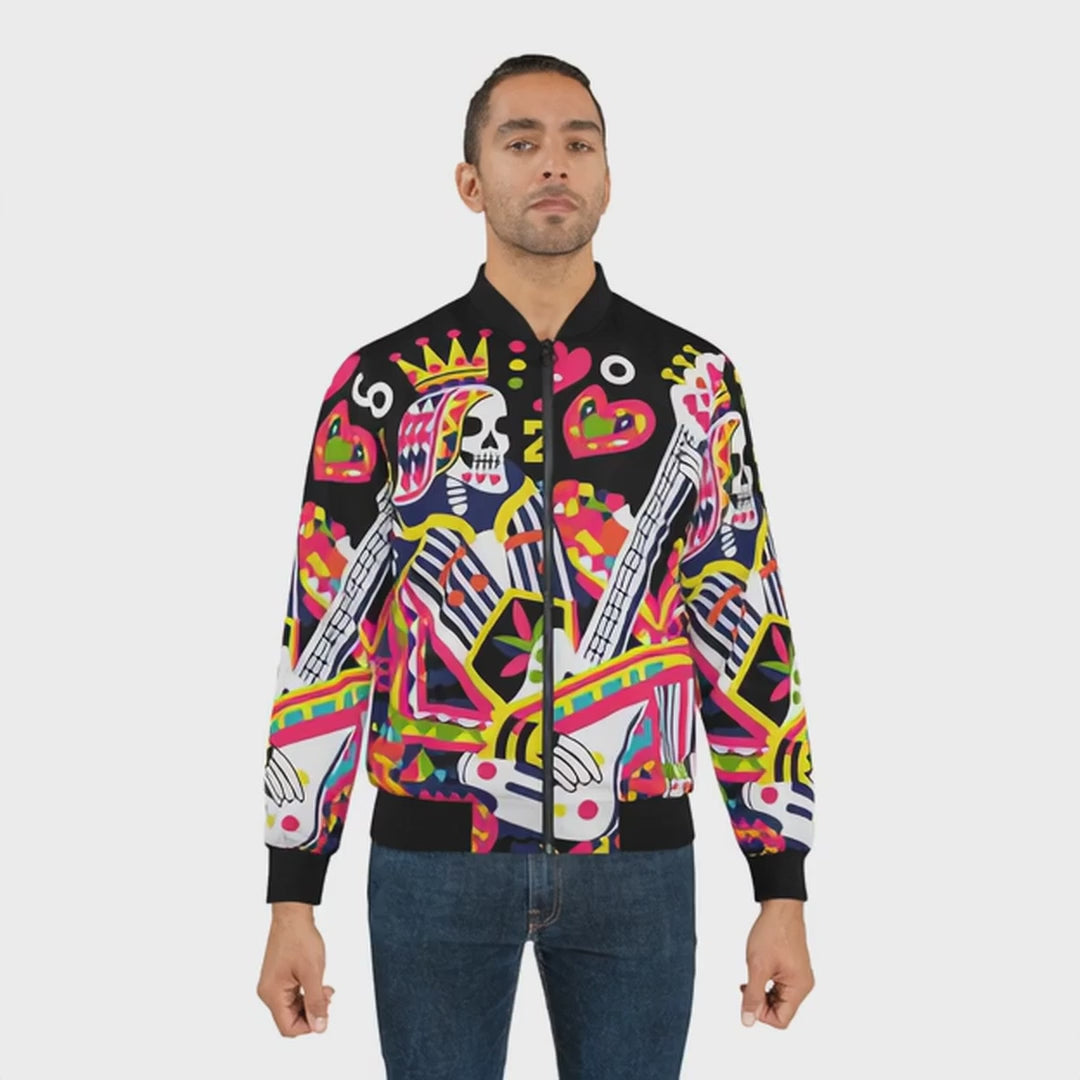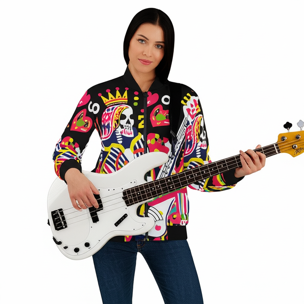This vibrant graffiti skull bomber jacket fuses neon tones with bold playing card motifs, creating a statement piece perfect for Gen Z trendsetters. The striking contrast of bright pink, yellow, and red against a black base makes it an instant streetwear essential. Best suited for Leo (confident and bold) and Gemini (playful and dynamic), this jacket empowers wearers to stand out with unapologetic style.