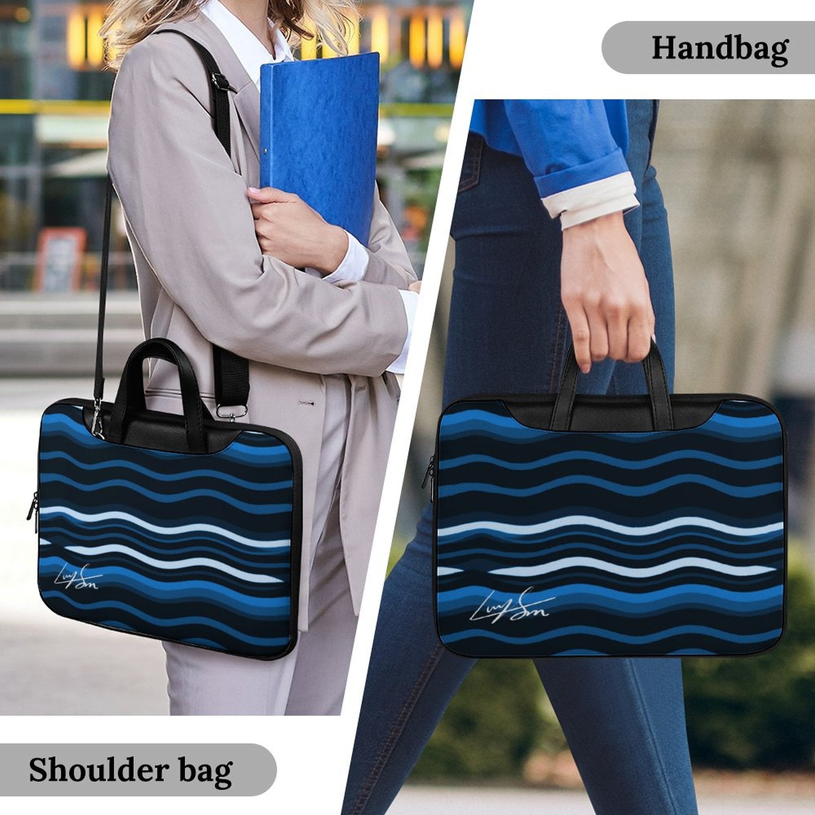 This stylish blue wave pattern laptop sleeve is the perfect gift for tech enthusiasts, suitable for young adults and anyone who loves modern design. With its 180-degree expandable opening, you can easily access your laptop and other items. The soft lining ensures your computer is protected from scratches, while the sturdy metal zippers provide long-lasting durability.