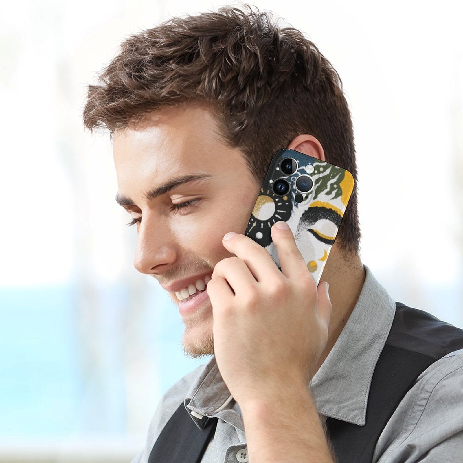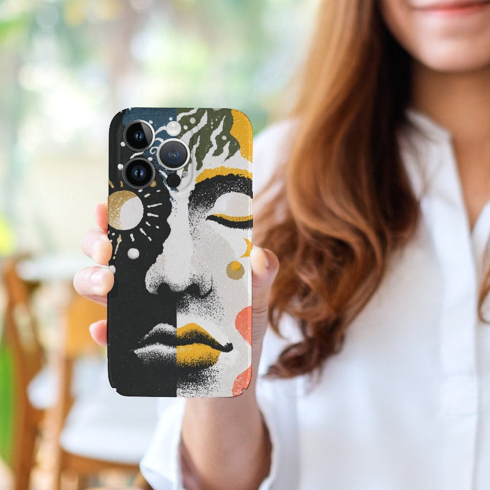 This iPhone 15 series case blends celestial moon and sun motifs with a surreal face illustration in a split-tone palette. Designed for Gen Z trendsetters, it radiates an abstract cosmic vibe perfect for those who seek inner expression. Libra’s elegance and Pisces' dreamy soul find harmony in this artful piece. Ideal gift for ages 18-35.