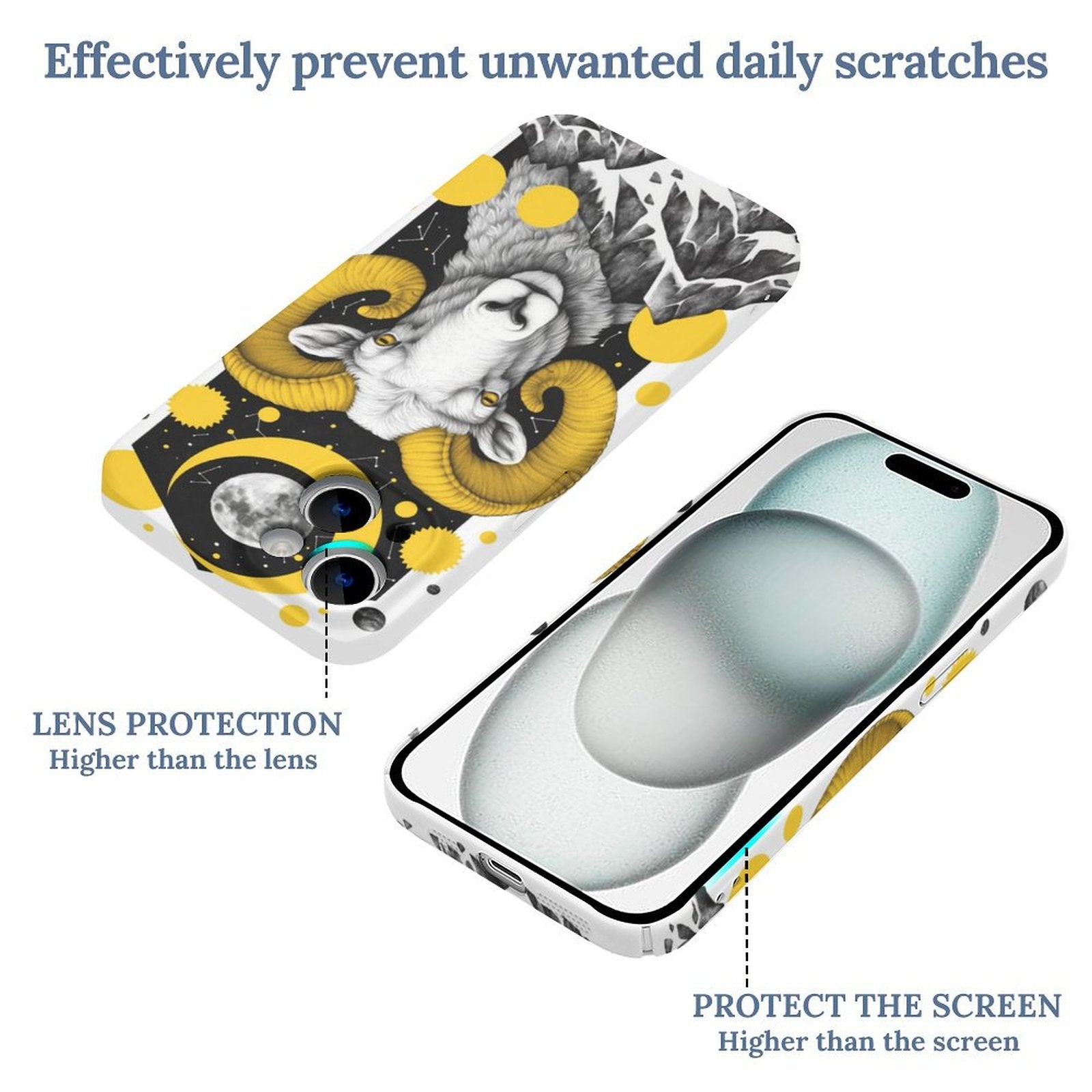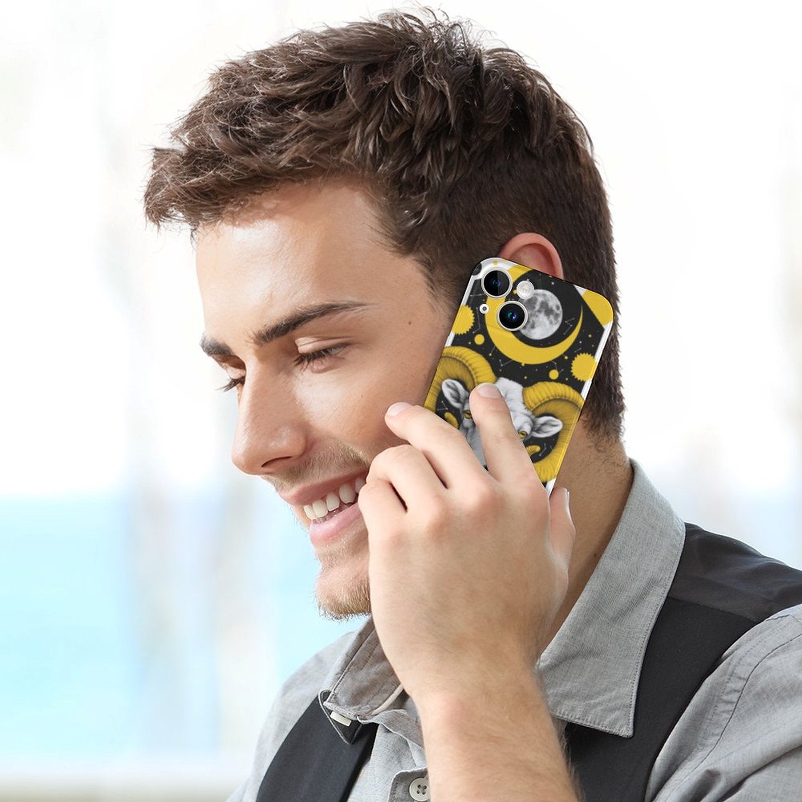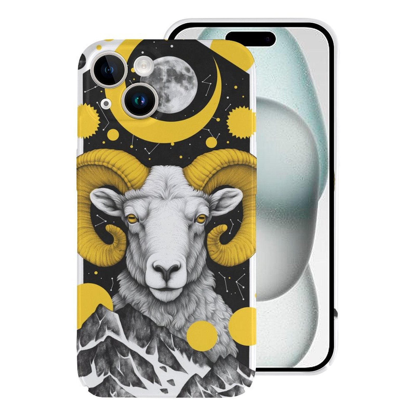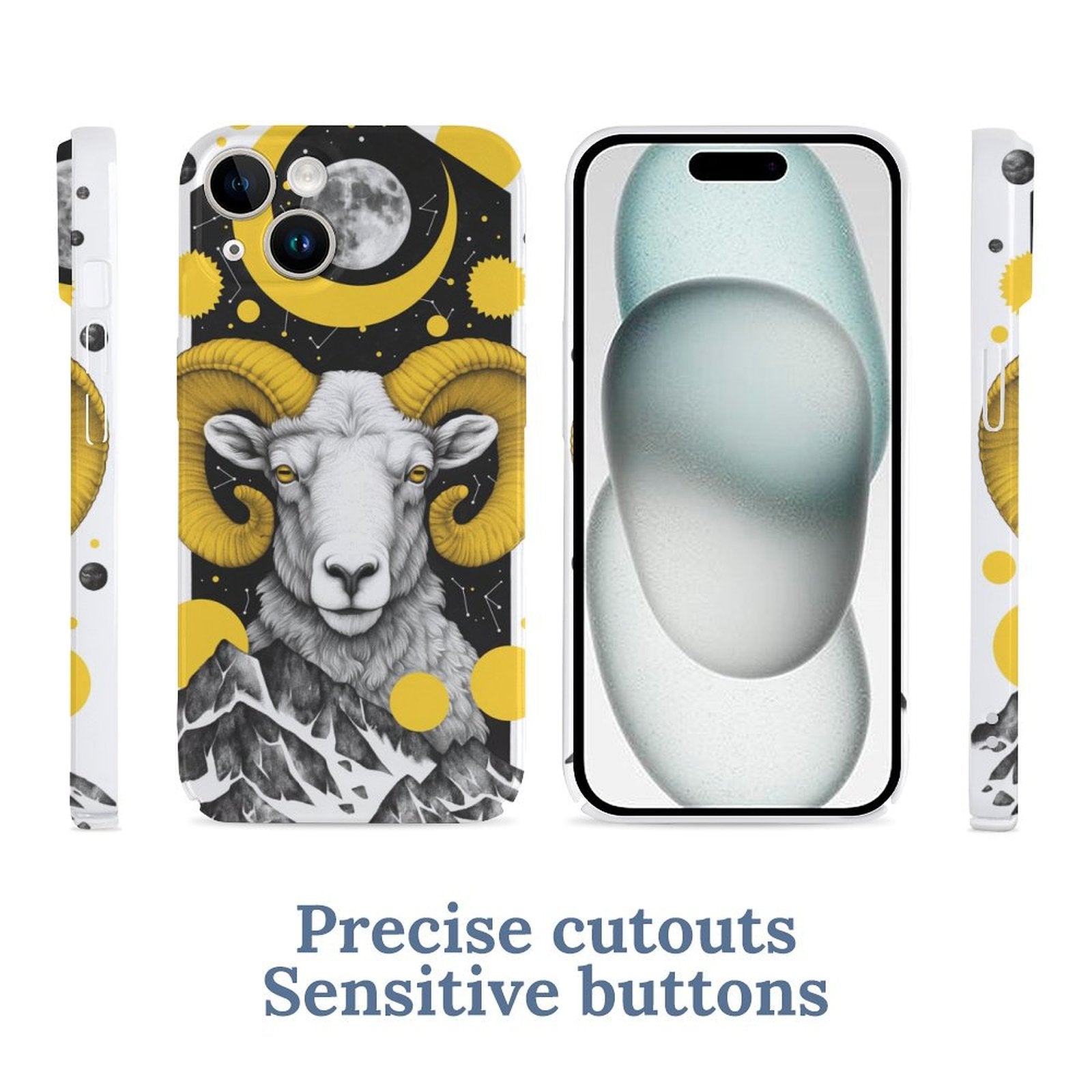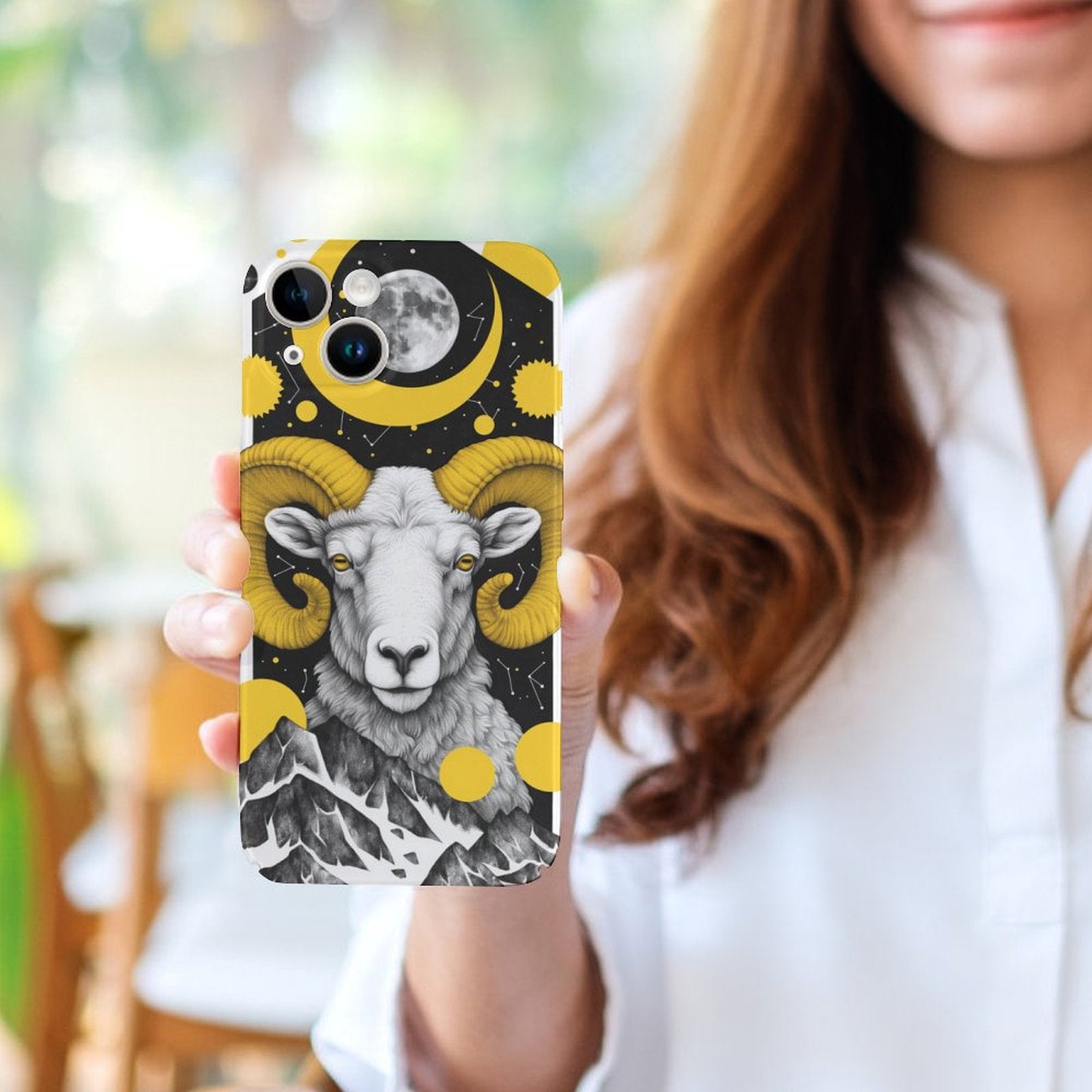 An artistic tribute to the power of Aries and the discipline of Capricorn, this iPhone 15 case features a fierce ram illustrated against snowy peaks and a cosmic night. The bold contrast of black, white, and golden yellow captures both strength and mystery—perfect for Gen Z with a bold soul. Best suited for ages 18–35.