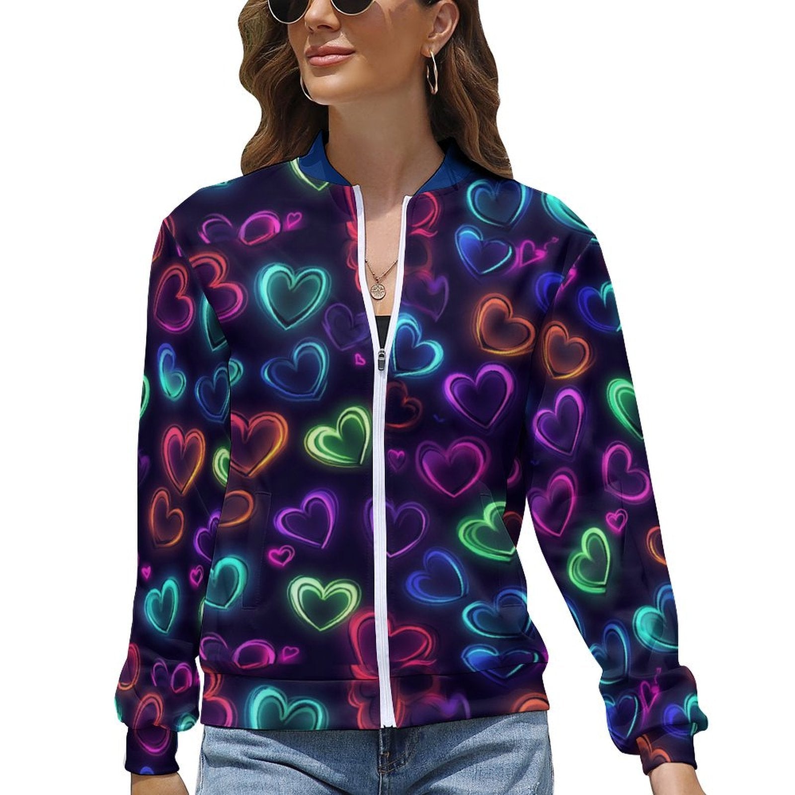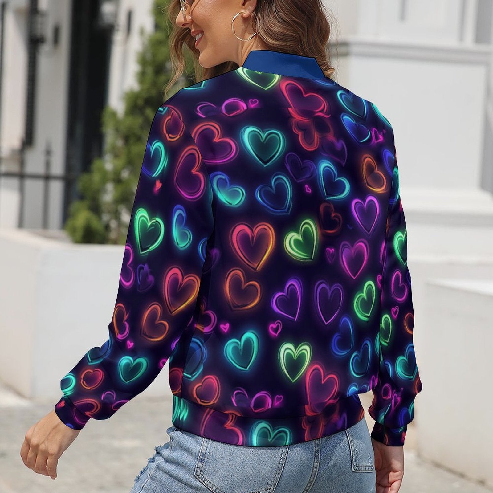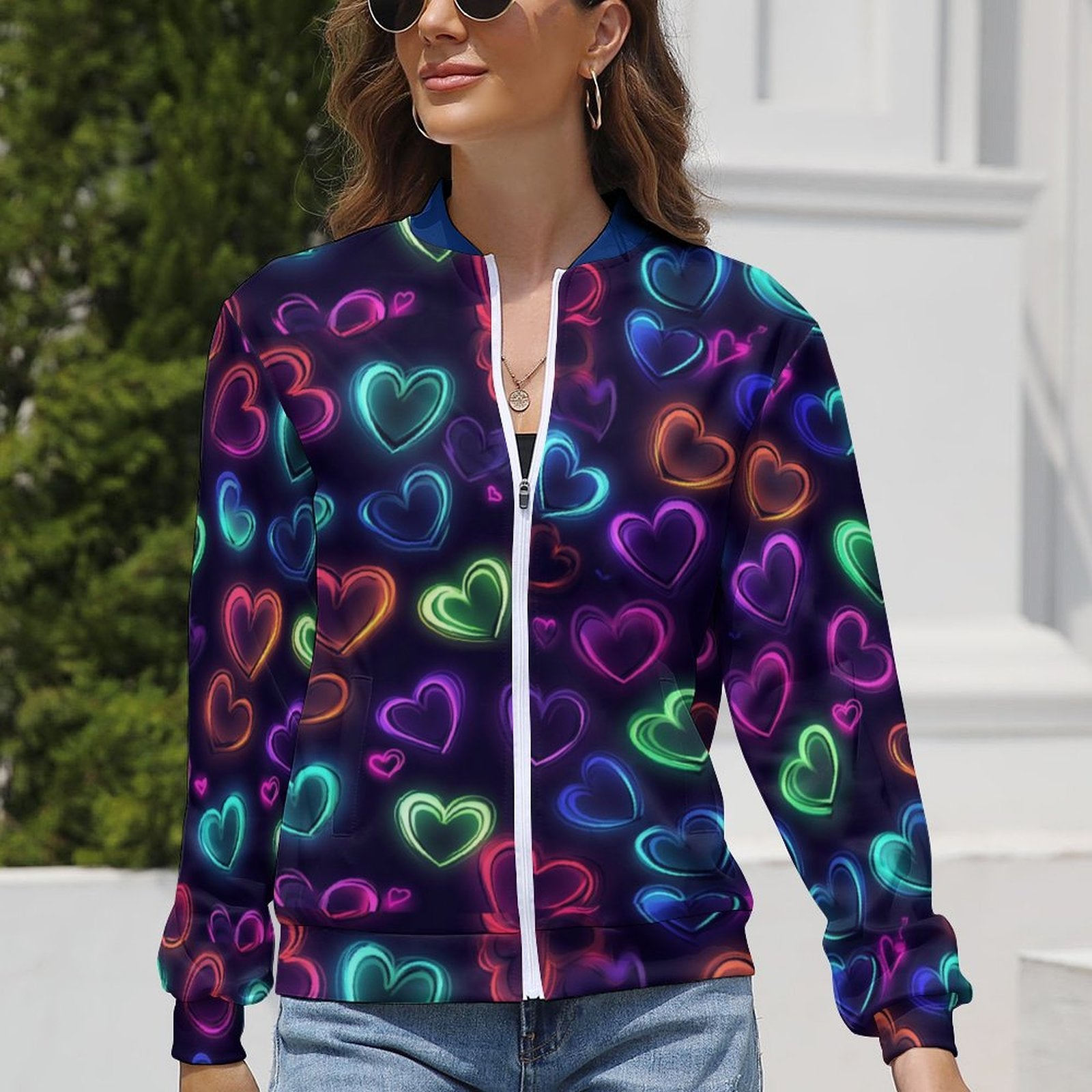 This Neon Heart Print Windbreaker Jacket is the ultimate gift for women who love to stand out with bold, colorful designs. Featuring a striking neon heart pattern against a dark background, this jacket combines fun, romance, and style into one. Made with lightweight, breathable fabric, it is perfect for layering during cooler weather or wearing on breezy days. Whether you're heading out for a casual outing or a night on the town, this jacket will keep you comfortable and stylish.