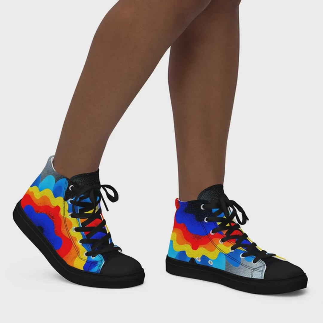 women’s high-top canvas shoes feature a vibrant rainbow wave gradient, paired with a sleek black sole and toe cap. The bold mix of red, yellow, and blue makes them a true statement piece for Gen Z fashion lovers. Perfect for Leo and Aquarius, these sneakers symbolize confidence and free spirit. Whether you’re 18–30, a student, a young professional, or a trendsetter, these shoes will instantly upgrade your streetwear look.