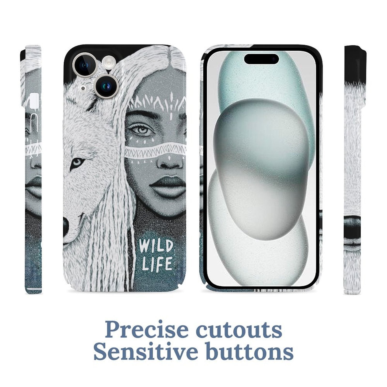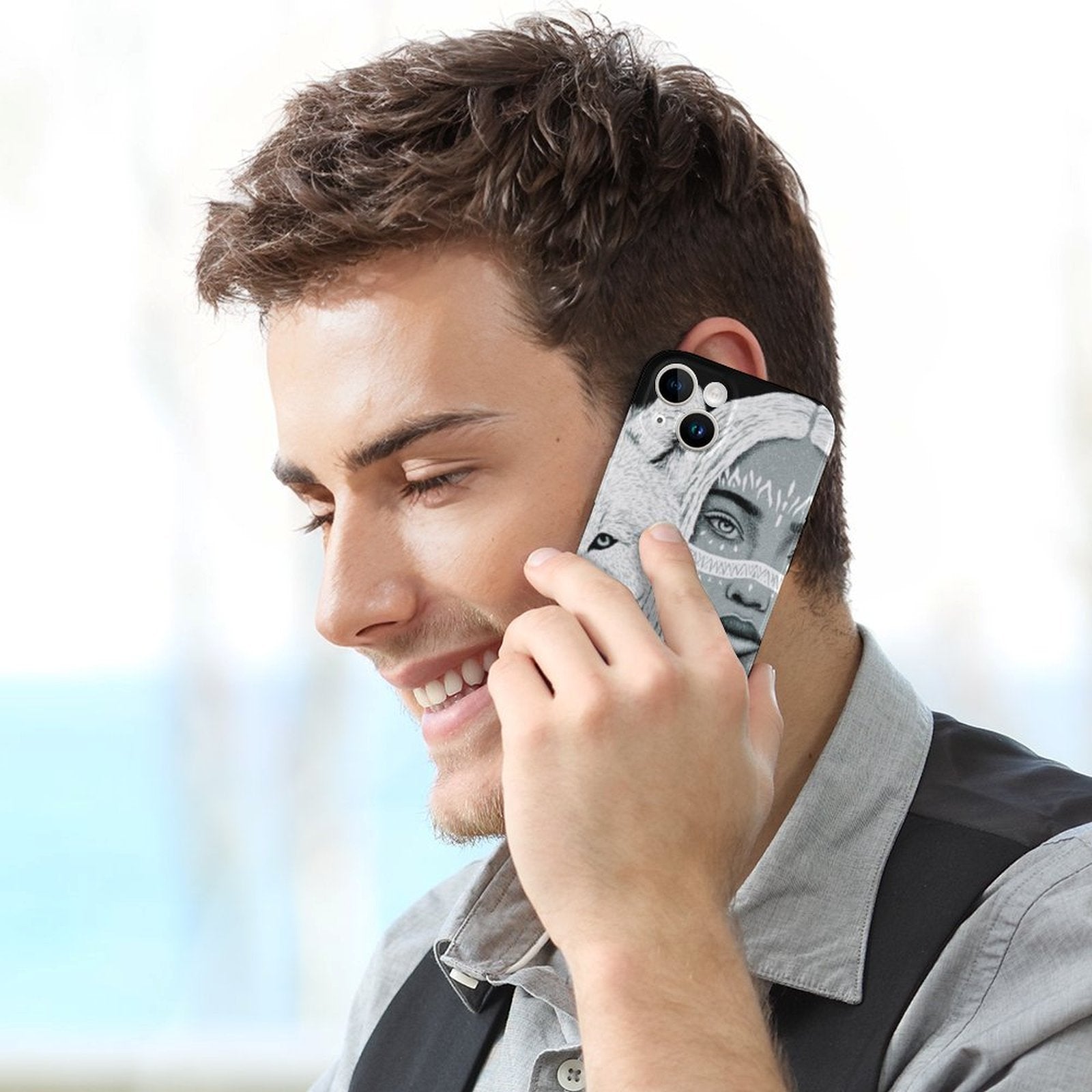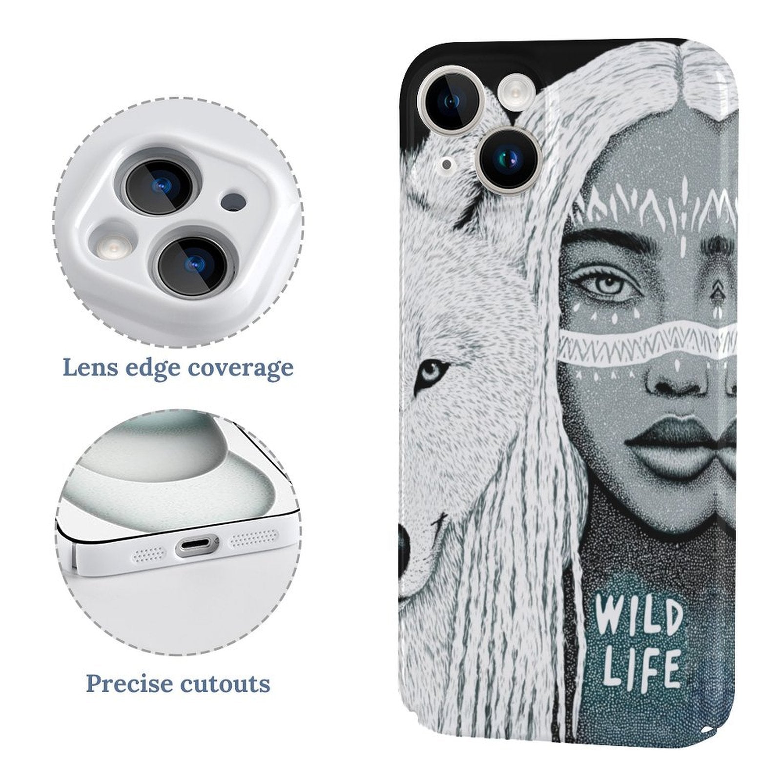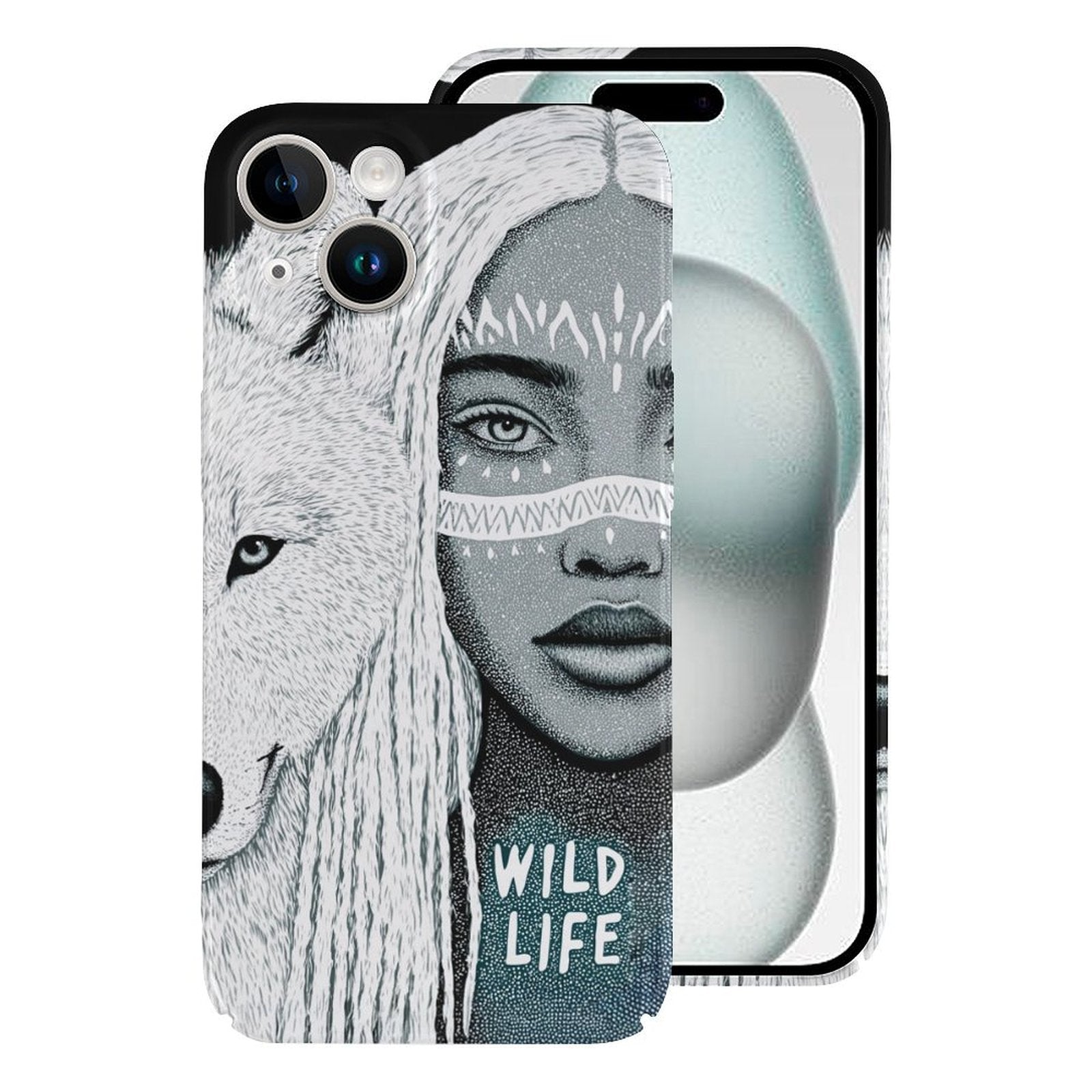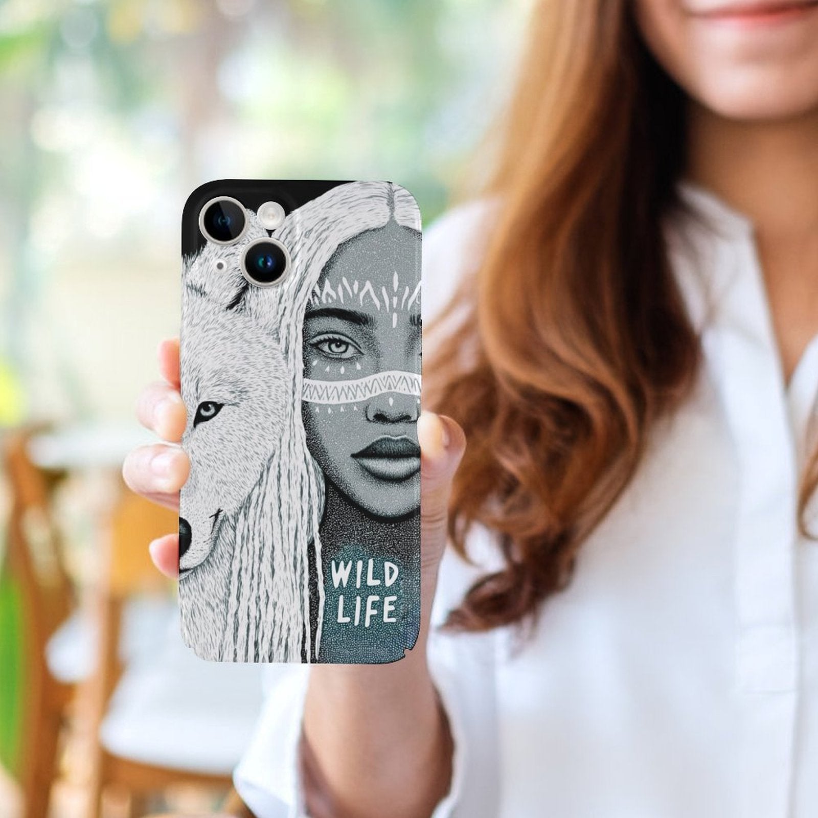This iPhone 15 case combines the fierce presence of a wolf with the mysterious energy of a gypsy girl in a stunning totem-style design. The cold gray tones evoke primal instincts and spiritual independence. Made for Gen Z souls who crave bold aesthetics—especially ideal for Sagittarius and Aries aged 18–30.